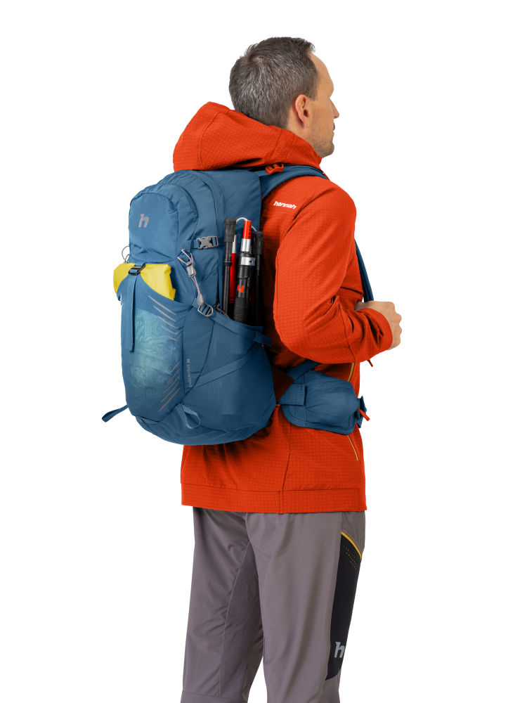 Jednokomorový turistický batoh 26 litrů je vyrobený z mechanicky odolného ripstop recyklovaného materiálu. Zádový systém Vario umožňuje proudění vzduch, pohodlí a stabilitu zajišťují nastavitelné polstrované ramenní popruhy a bederní pás s kapsou.V případě potřeby lze bederní pás z batohu jednoduše odejmout. Zádový systém i ramenní popruhy jsou zároveň vyrobené z prodyšné a rychleschnoucí mechanicky odolné síťoviny. Na hrudním popruhu, kterým zajistíte stabilitu ramenních popruhů, najdete pohotovostní píšťalku. Nechybí úchyty na trekové hole či na jiný potřebný materiál. Dvě boční kapsy a přední síťovaná kapsa mohou sloužit pro rychlé odložení částí oblečení či drobností. Batoh lze jednoduše stáhnout bočními kompresními popruhy na menší objem. Nechybí integrovaná pláštěnka s reflexními prvky a kapsa na vodní rezervoár s vývodem. Batoh je vyroben z recyklovaného polyesteru (na výrobu jednoho kusu bylo zrecyklováno 12ks PET lahví o objemu 0,5l). Při výrobě tohoto produktu došlo tedy k významné úspoře energie a redukci uhlíkové stopy.