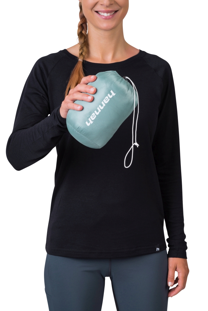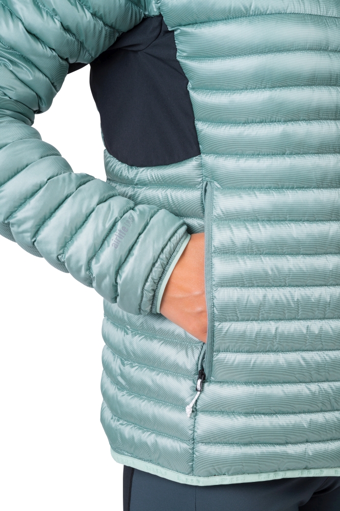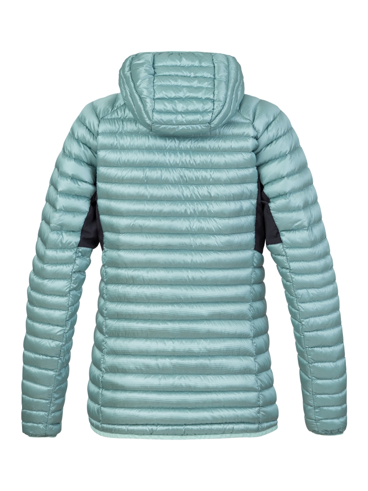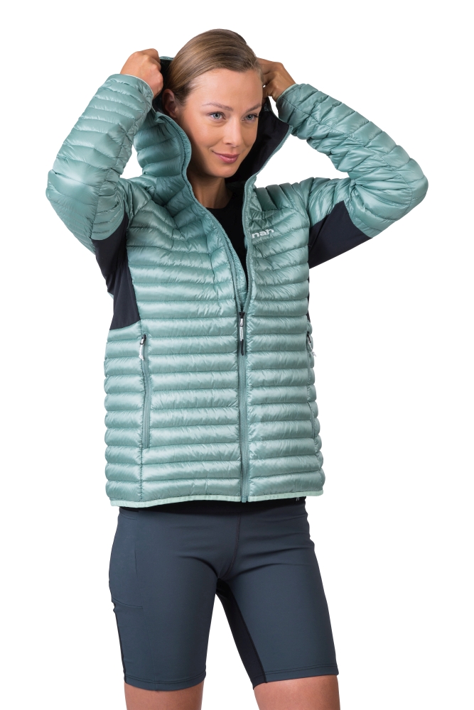 Dámská odlehčená péřová bunda s povrchovou úpravou materiálu proti nasákavosti. Pružné panely v podpaží umožňují uvolněný pohyb a komfort při nošení. Technologie komorového plnění obsahuje vysoce kvalitní kachní peří v poměru 80/20 s plnivostí 750cuin. Prachové kachní peří pochází z certifikovaných farem a zpracovává se v souladu s životním prostředím. Bunda poskytuje výborný tepelný komfort v kombinaci s nízkou váhou a sbalitelností do přiloženého transportního obalu. Svrchní lehký a pevný materiál Airlite DMF od japonského výrobce spolehlivě zabraňuje pronikání péřových vláken vně. Samozřejmostí u takového typu bundy je sportovní střih s anatomicky tvarovanými rukávy a zakončením spodního okraje, rukávů a kapucí pružným lemem. Odlehčené a flexibilnější YKK zipy a technicky výše umístěné hlavní kapsy přístupné při nošení sedáku či batohu. Bunda je vhodná jako svrchní tepelně izolační vrstva, v případě nepřízně počasí může výborně posloužit jako záložní druhá izolační vrstva pod nepromokavou bundu. Certifikace Bluesign je zárukou transparentnosti a využití zdrojů šetrných k životnímu prostředí při výrobě.