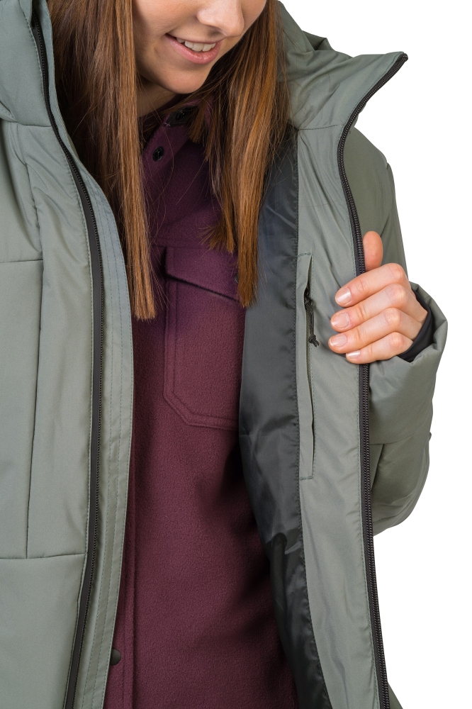 Dámská stylová zimní bunda Hannah Tea s membránou Resstex 5000. Zimní stylová bunda je skvělou volbou do města nebo pro volný čas. Odolnost proti dešti, mokrému sněhu i větru zajišťuje membrána Resstex 5000 s DWR úpravou. Kvalitní polyesterové rouno Duratherm High Loft je lehké, nadýchané, měkké a vyniká svými termoizolačními vlastnostmi. Bunda má zateplený límec s kapucí se stahováním, dvě zateplené hlavní kapsy na zip a jednu vnitřní kapsu na zip. Spodní kraj bundy je regulovatelný pomocí stahování. Rukávy jsou zakončeny vnitřní elastickou manžetou, která zamezuje úniku chladu.