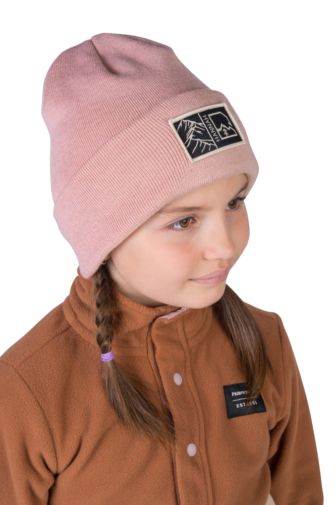 Dětská stylová čepice Hannah Billy JR. Zimní dětská čepice má jednobarevné provedení a moderní design. Čepice dobře sedí a drží na hlavě díky širokému ohrnutému lemu. Dekorativní nášivka s motivy hor na středu ohrnutého lemu. Příjemný materiál je kompozicí 50% recyklovaného polyesteru a 50% akrylu.