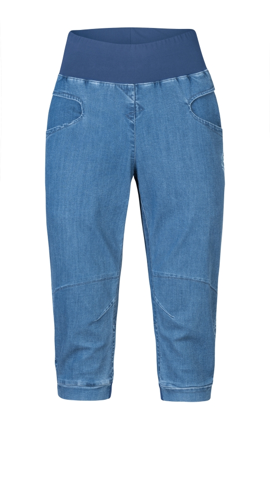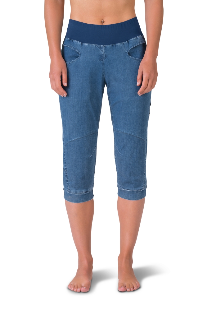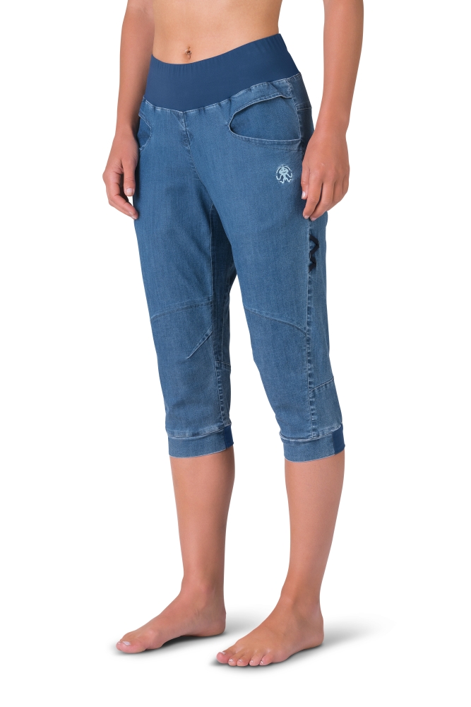 Dámské lezecké tříčtvrteční kalhoty Chain Capri vypadají naprosto civilně a dají se nosit jak na skálu a boulder, tak i do města. Jsou vyrobené z ultralehké džínoviny, která je pružná, prodyšná a rychle schne. Díky širší manžetě v pase kalhoty dobře padnou a vsazený klín umožňuje pohyb bez omezení. Se zdvojenými tvarovanými koleny není problém opřít se o drsnou skálu. Manžeta na nohavicích je vzadu stažená do gumy. Zajímavým detailem je i ozdobné poutko na kartáček.