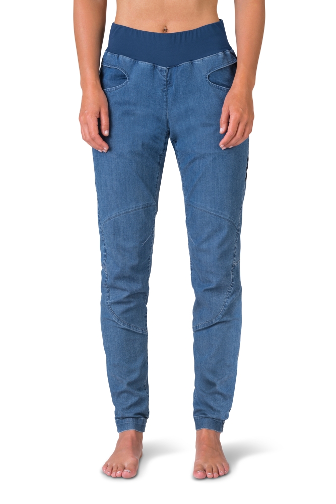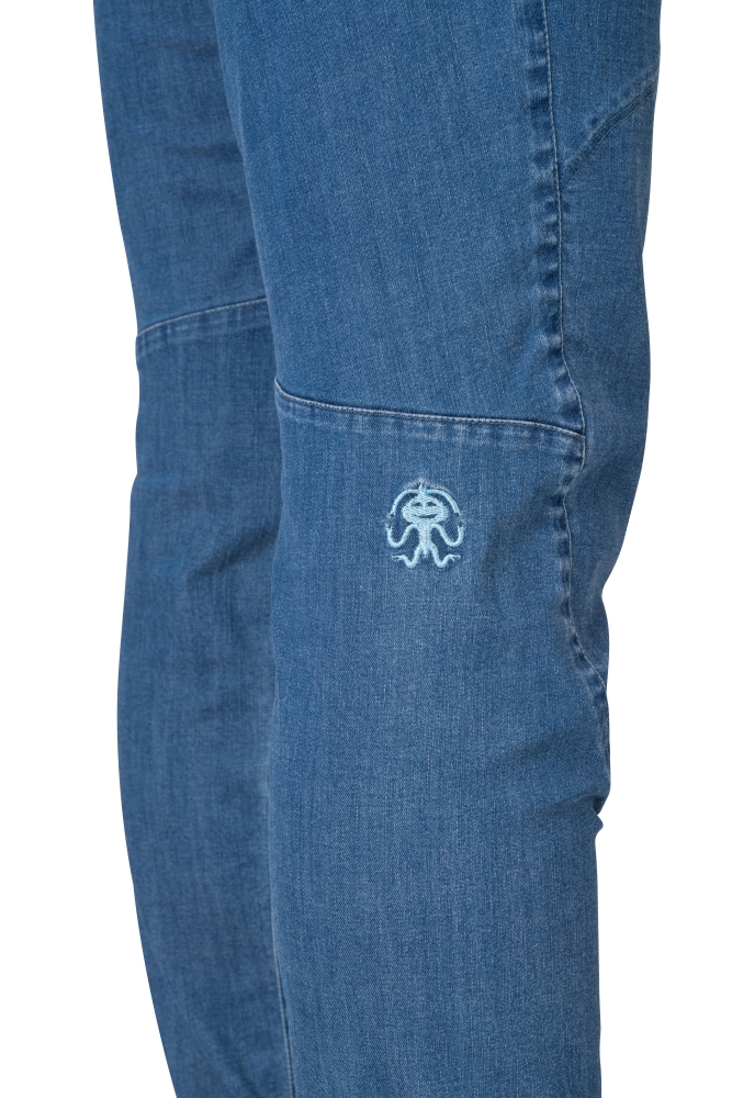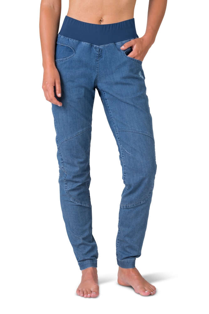 Lezecké kalhoty Chain, které vypadají naprosto civilně, a přesto jsou ideálním parťákem na skálu. Ultralehká džínovina je pružná, prodyšná a rychle schne. Širší manžeta a vnitřní stahování v pase se postarají o to, aby kalhoty dobře padly. Vsazený klín nelimituje při pohybu, což lezkyně dozajista ocení. Zdvojená tvarovaná kolena snesou i hrubší zacházení na skále. Spodní manžeta je vzadu stažená do gumy, aby nohavice dobře držely nad kotníkem. Guma je ovšem jen vzadu, takže zepředu kalhoty vypadají jako normální vyúžené džíny. Zajímavým detailem je i poutko na kartáček, které samo o sobě vypadá jako ozdobný prvek.