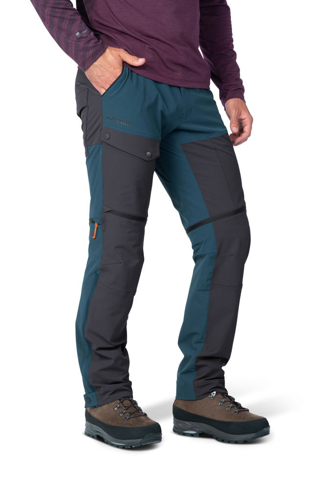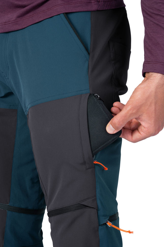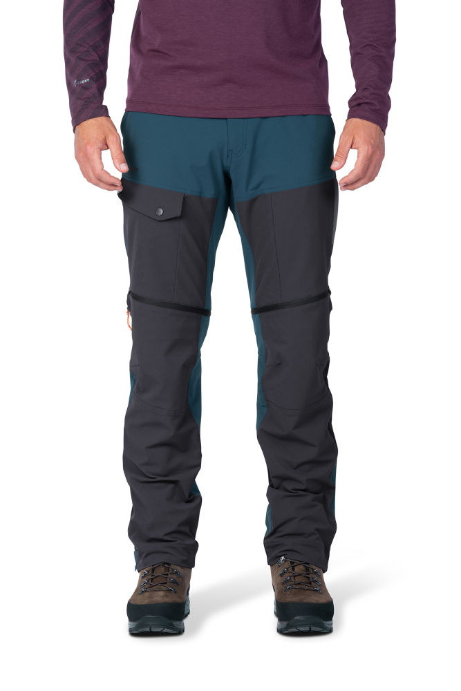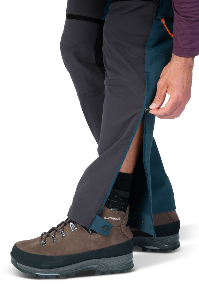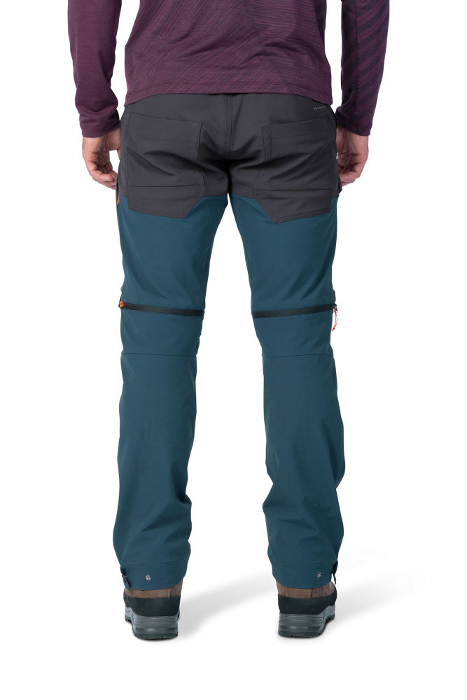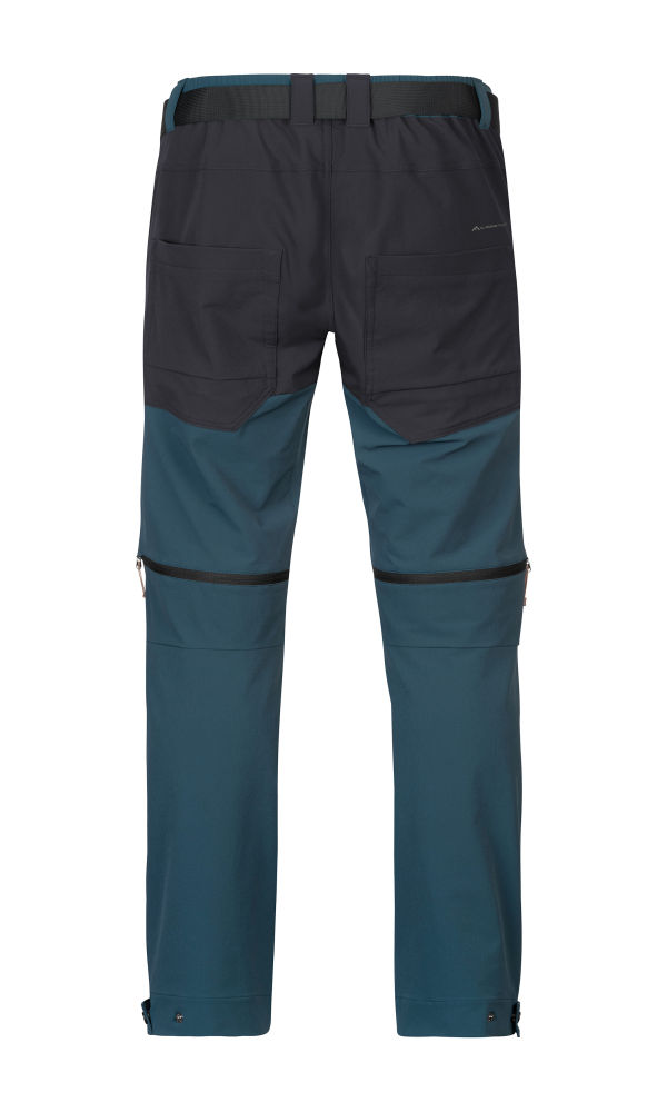 Pánské odepínatelné technické outdoorové kalhoty jsou vyrobeny z mechanicky odolného, větruvzdorného, trvale vodoodpudivého a prodyšného materiálu AFT Double Weave Pro. Povrchová úprava DWR - C0 bez PFC je šetrnější k životnímu prostředí a zajistí nenasákavost vrchního materiálu. Technický střih kalhot má šikmo řešené odepínatelné nohavice s bočním rozepínáním na zip. Odepnutím nohavic jsou z kalhot rázem parádní šortky s délkou lehce nad kolena. Šortky přesahují zip, což zamezuje případnému škrábání zipu. Nohavice mají anatomicky tvarovaná kolena a spodní kraj s regulací šířky na patent, který se přizpůsobí různé botě a potřebám. Kalhoty mají regulovatelnýobvod pasu páskem a disponují kombinací různých typů kapes v přední i zadní části kalhot. V přední části jsou dvě dostatečně hluboké a pohodlné kapsy, na stehnech dvě kapsy na zip. V zadní části pak kalhoty disponují dvěma níže posazenými hlubokými kapsami, které kromě praktické funkce mají i funkci designovou. Nový materiál AFT Double Weave Pro klade kromě již zmíněných technických parametrů důraz na aspekt udržitelné výroby. Materiál je navíc ošetřen povrchovou vodoodpudivou úpravou, která je bez fluorkarbonů, a tím je šetrnější k životnímu prostředí (PFC free). Certifikace Bluesign je zárukou transparentnosti a využití zdrojů šetrných k životnímu prostředí při výrobě. Kalhoty jsou ideální na vícedenní turistiku a náročný pohyb v horách.