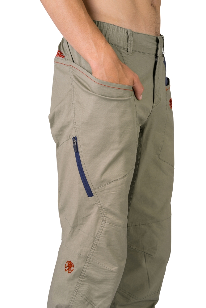 Díky propracovanému střihu Vás nebude nic omezovat. Drobnosti schováte do opravdu prostorných předních kapes, kapsička na kartáček je samozřejmostí, ale top je kapsička se zipem na boku stehna. Třeba na telefon. Její pozice je vyladěna na milimetry, abyste se do ní bez problémů dostali i v sedáku. Kalhoty mají poklopec, gumu v celém obvodu i poutka na pásek.