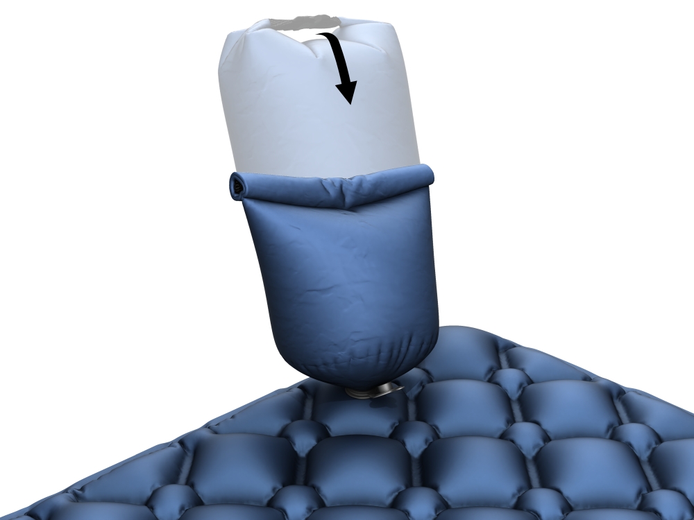 Spolehlivý dvouvrstvý ventil se zpětnou klapkou proti nežádoucímu zpětnému návratu vzduchu. Dodáváno včetně opravné sady a vaku na sbalení. Součástí balení je i nepromokavý rolovací obal, který zároveň slouží i pro nafouknutí karimatky.