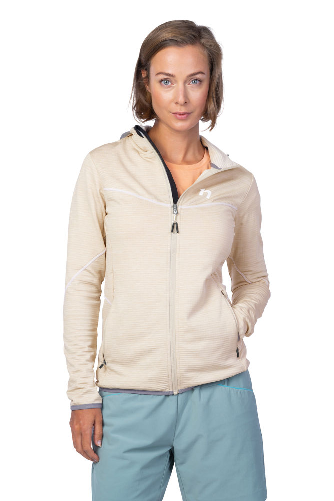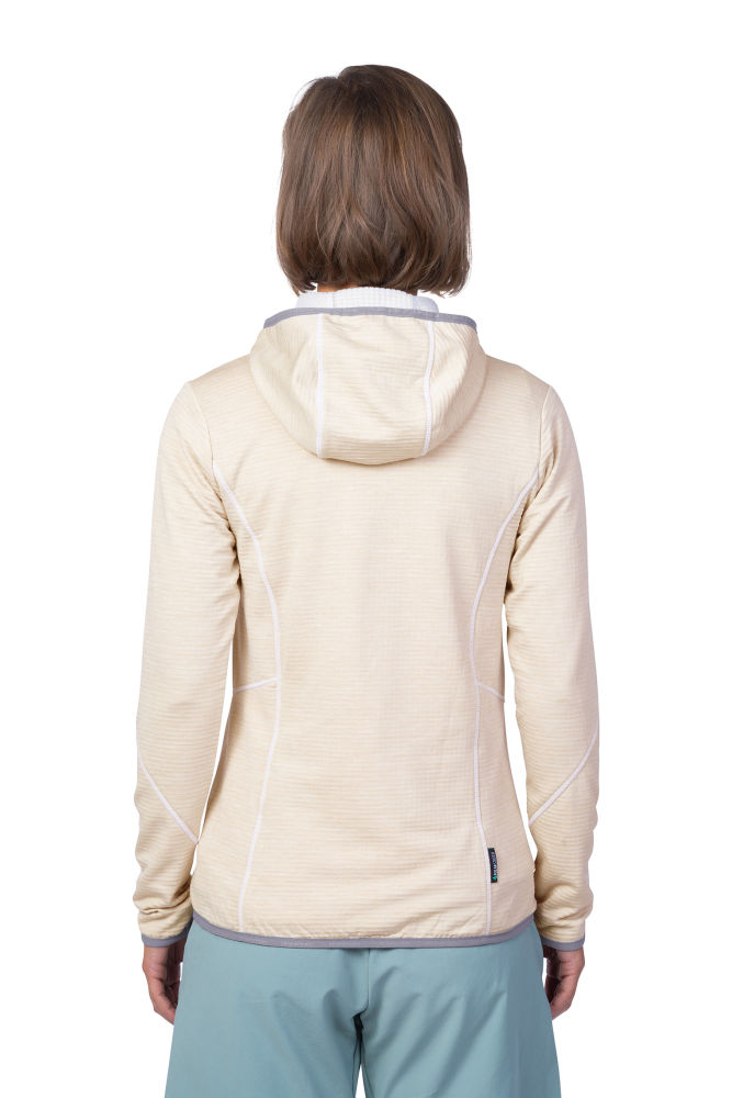Dámská funkční mikina s kapucí z pružného a prodyšného materiálu Polarstretch Grid. Sportovní lehce vypasovaný Alpine střih dobře přilne k tělu, v kombinaci s použitým vysoce pružným materiálem neomezuje v pohybu. Materiál Polarstretch Grid má na vnitřní straně speciální strukturu jemné mřížky, která mikině poskytuje výborný teplotní komfort a zároveň prodyšnost. Reverzní dlouhý zip se stojáčkem má na konci ochrannou krycí légu proti škrábání u krku. Kapuce, spodní lem i rukávy jsou zakončené pružnou gumou. Dvě hlavní kapsy na zip. Dekorativní prošití a materiál v melange provedení. Ideální jako druhá izolační vrstva v průběhu celého roku.