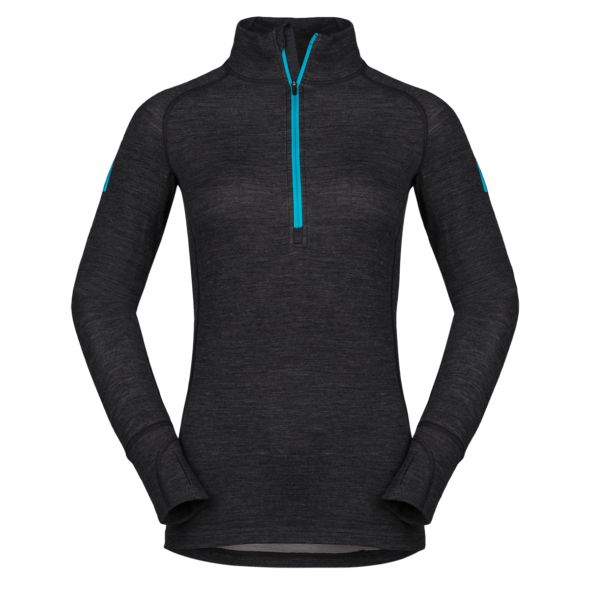 Měkký top s dlouhými rukávy, otvory na palce, které zabraňují vyhrnování a s vysokým límcem na zip - to je Nora W Merino Zip Top.