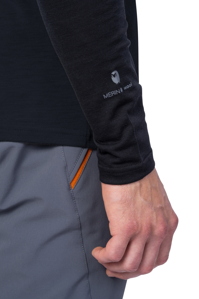 Pánské funkční tričko z přírodního materiálu Merino wool. Tričko s dlouhým rukávem je vyrobeno z přírodního materiálu Merino wool, který rychle odvádí přebytečnou vlhkost, dobře schne a přirozeně odolává zápachu. Jemné přírodní vlákno ze speciálně vyšlechtěných ovcí neškrábe a i malá gramáž dokáže účinně zahřát. Příměs polyamidového vlákna zvyšuje celkovou mechanickou odolnost trička. Triko má posazené rukávy do raglánu, tedy dobře sedí na těle a neomezuje v pohybu. Využití najde během skialpinismu, turistiky i při běžném nošení.