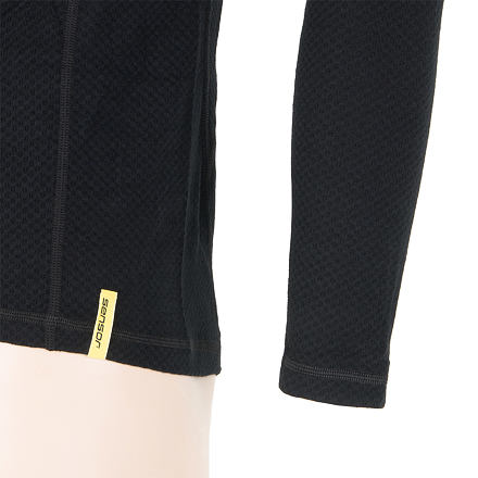Tričko s dlouhým rukávem a krátkým zipem u krku vyrobené z úpletu unikátní konstrukce kombinující polyester na vnitřní straně a vysoce kvalitní Merino vlnu z Nového Zélandu.