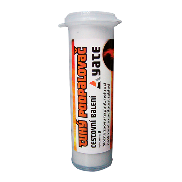 Cestovní balení, 6 kusů tablet v PE tubě, kterou je možno opakovaně naplnit. Tuba chrání tablety před vlhkem a poškozením. Tablety jsou vhodné jako palivo do vařiče na tuhý líh nebo pro roztápění kamen, ohnišť a grilů. Pro rozdělání ohně obvykle stačí 1/2 tablety.Varování. Hořlavá tuhá látka. Může vyvolat alergickou kožní reakci. Při vdechování může vyvolat příznaky alergie nebo astmatu nebo dýchací potíže. Uchovejte mimo dosah dětí. Uchovávejte/skladujte odděleně od dosahu možných zdrojů zapálení. Zamezte vdechování prachu/dýmu. Zabraňte styku s očima. Po manipulaci důkladně omyjte ruce vodou a mýdlem. Použijte ochranné rukavice.